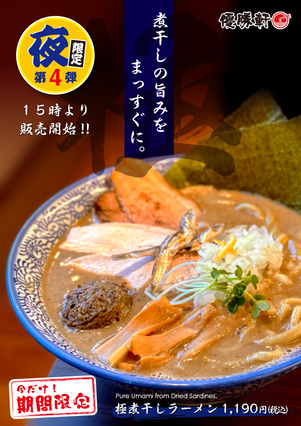 豚と野菜の旨味が溶け込んだ豚骨スープに、山盛り野菜とニンニク、背脂をトッピングした優勝軒を代表する濃厚ガッツリ系らーめんです。野菜、ニンニク、背脂の量をお好みで調節できるので、ボリューム満点の全部増しから、山盛り野菜+背脂少なめのヘルシー系など、自分好みにカスタマイズできます。老若男女問わずに幅広いお客様から人気があります。