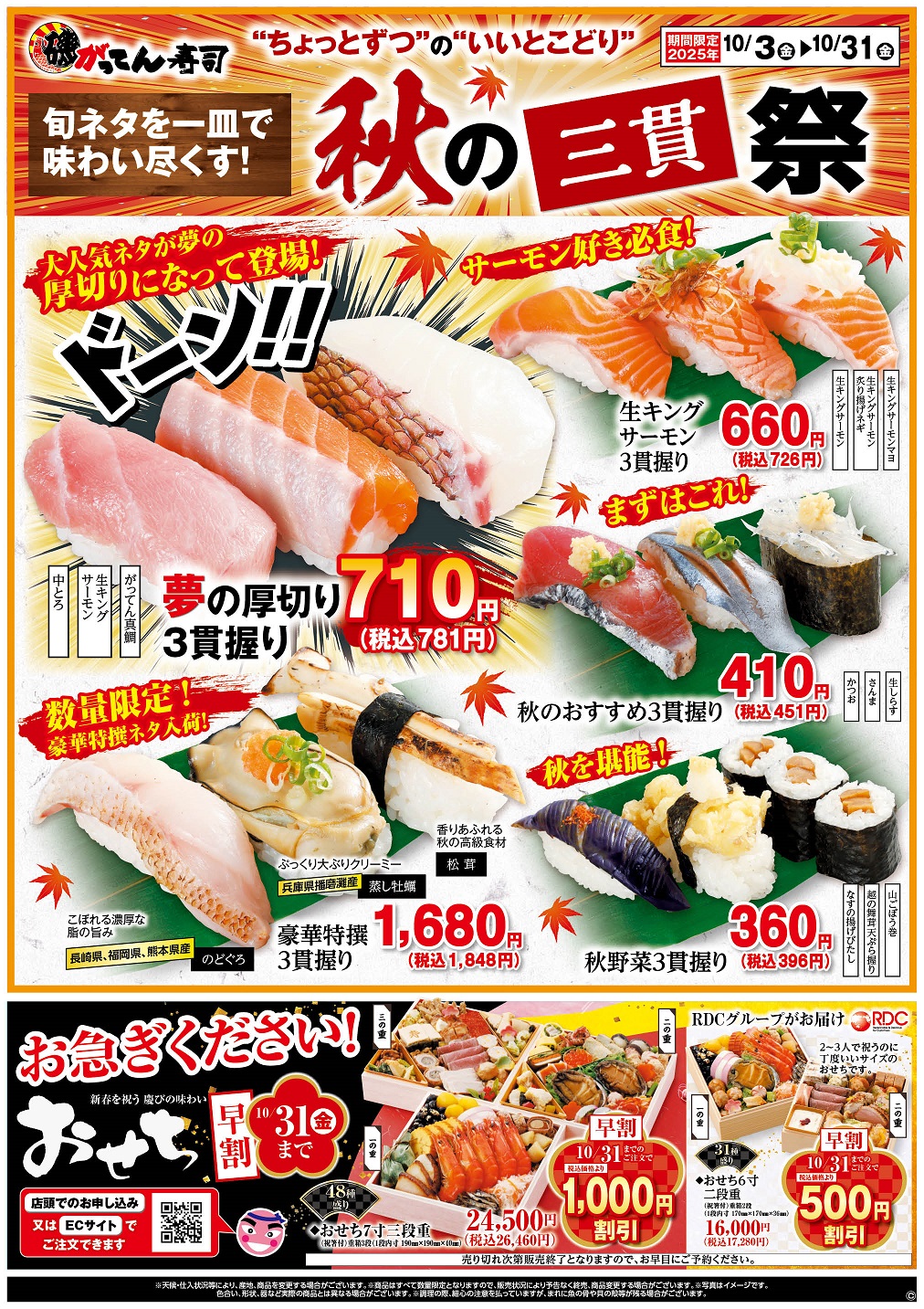 磯のがってん寿司 秋の三貫祭【2025年10月3日~10月31日までの期間限定販売】