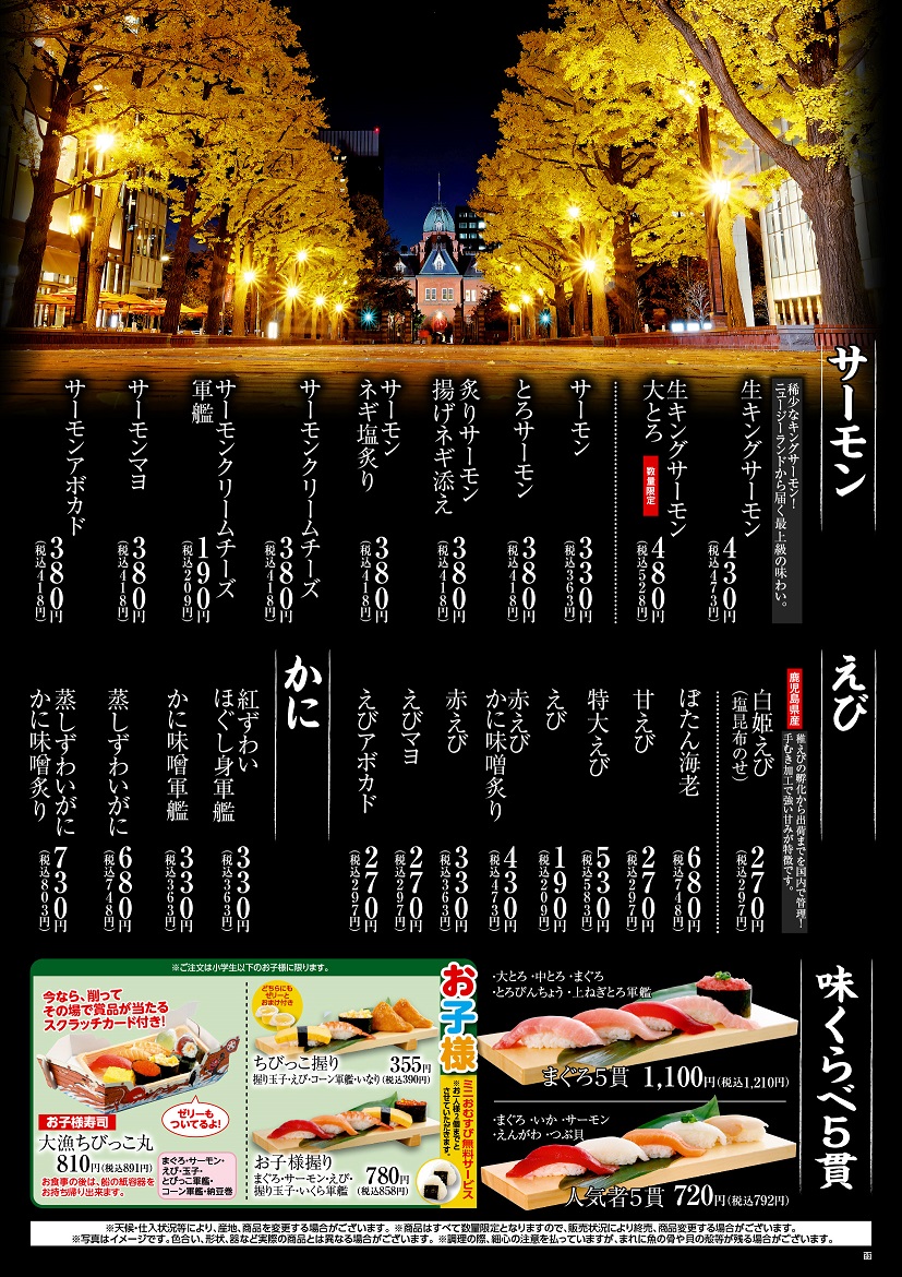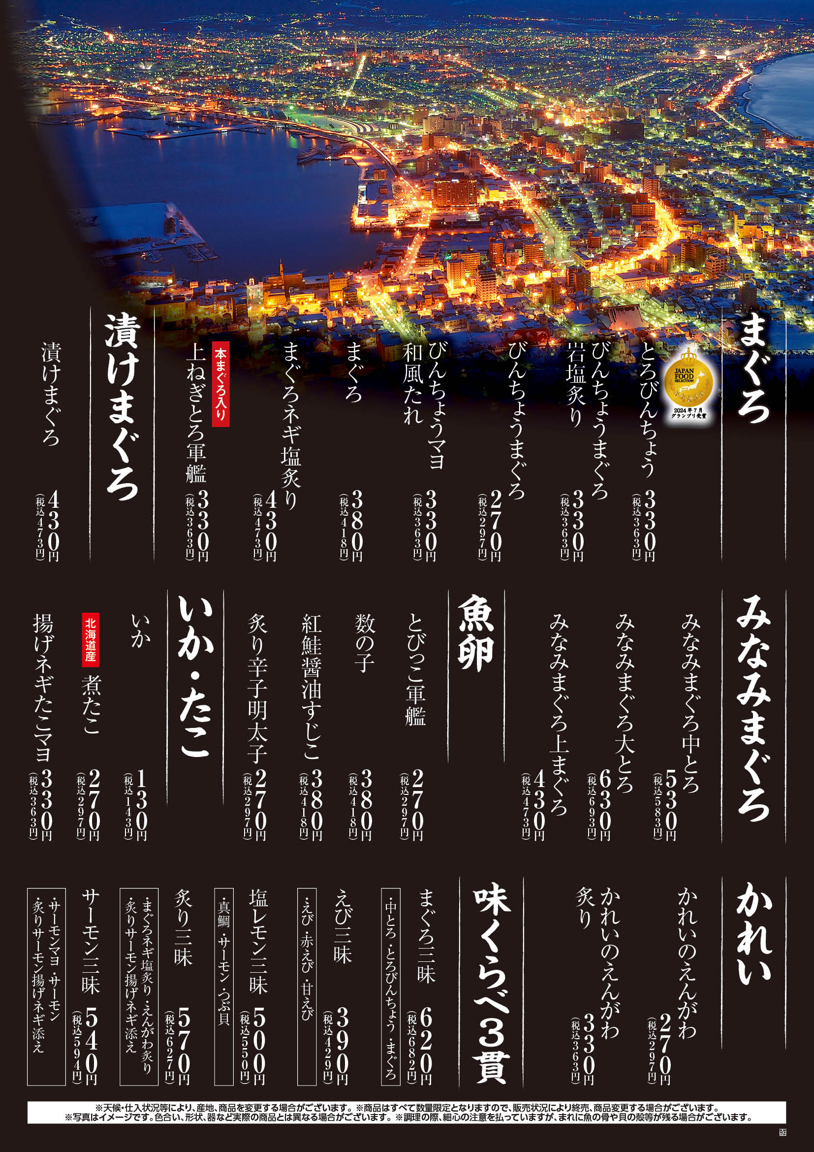活ほっき貝、活ほたて、煮たこ、季節のいか、いくら軍艦