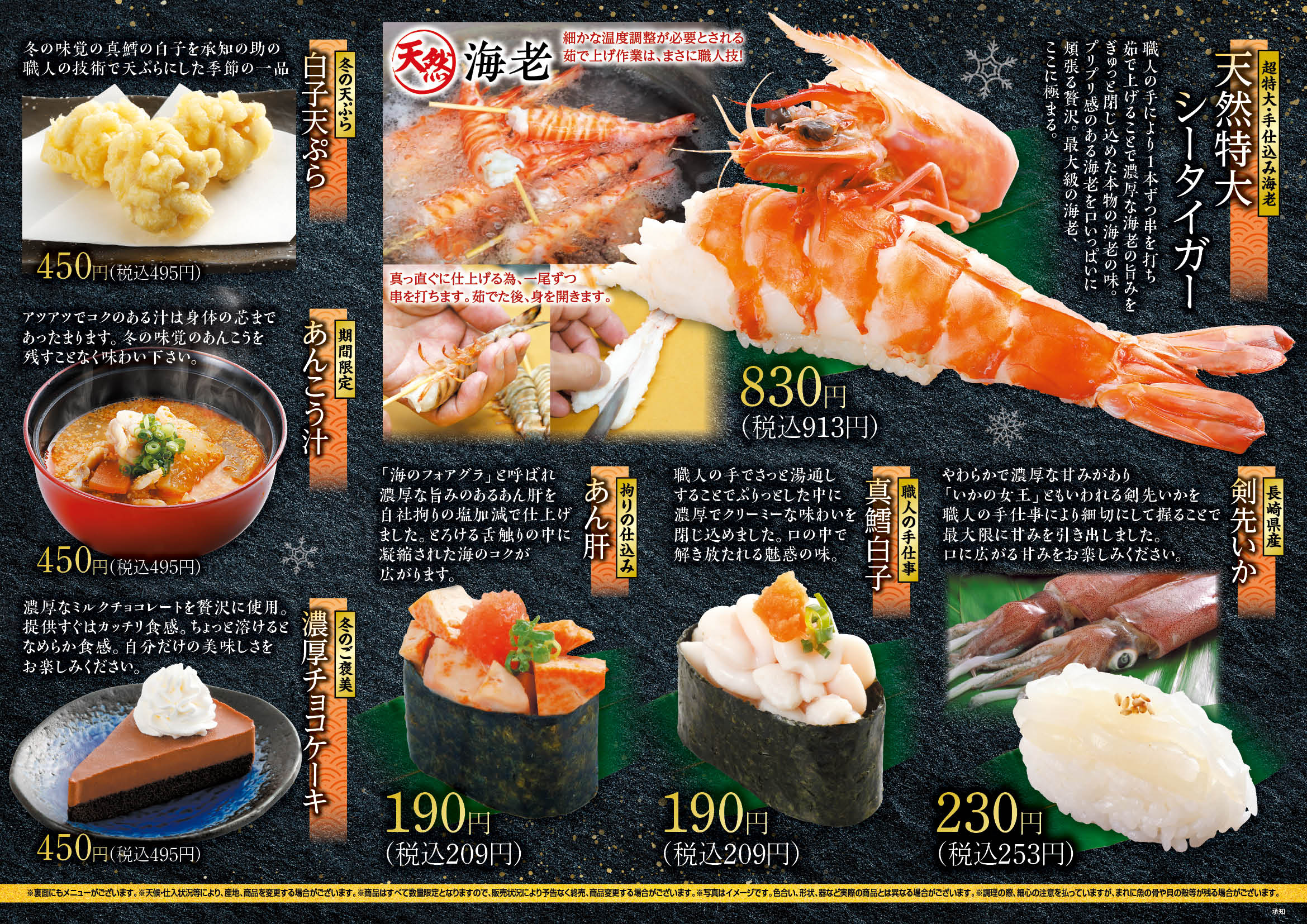 とらふぐ、がってんぶり、あん肝軍艦、真鱈の白子軍艦