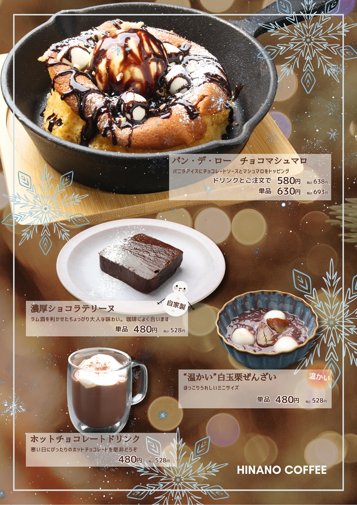 冷えた身体を優しく包み込む「ホットチョコレートドリンク」や、ほっこり嬉しい「白玉栗ぜんざい」もご用意しております。
