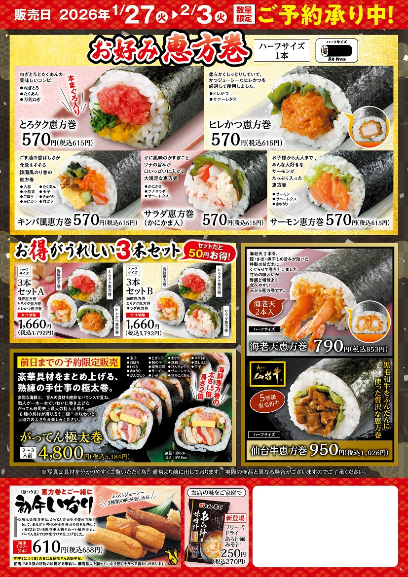 定番の海鮮恵方巻から、中とろ・数の子が入った豪華海鮮招福太巻、お子様にも人気のヒレかつ巻まで、がってん寿司ならではの美味しさをお届けします!🔥