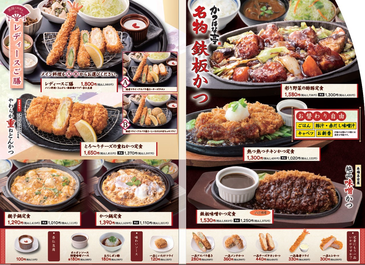 - 名物 鉄板かつシリーズ:熱つ熱つの鉄板で提供する「彩り野菜の酢豚定食」や「鉄板味噌かつ定食」など、かつはな亭ならではの新しい楽しみ方。