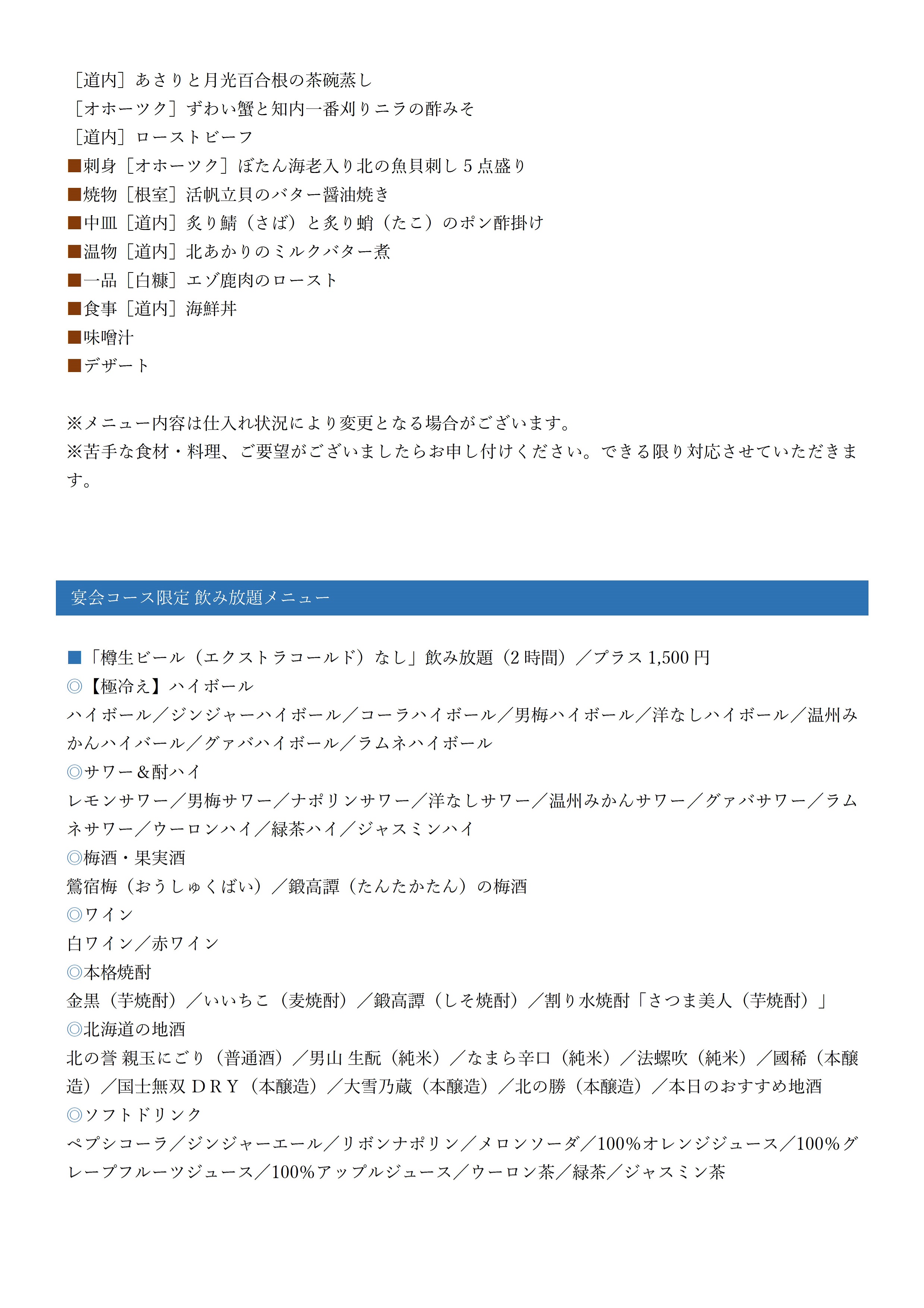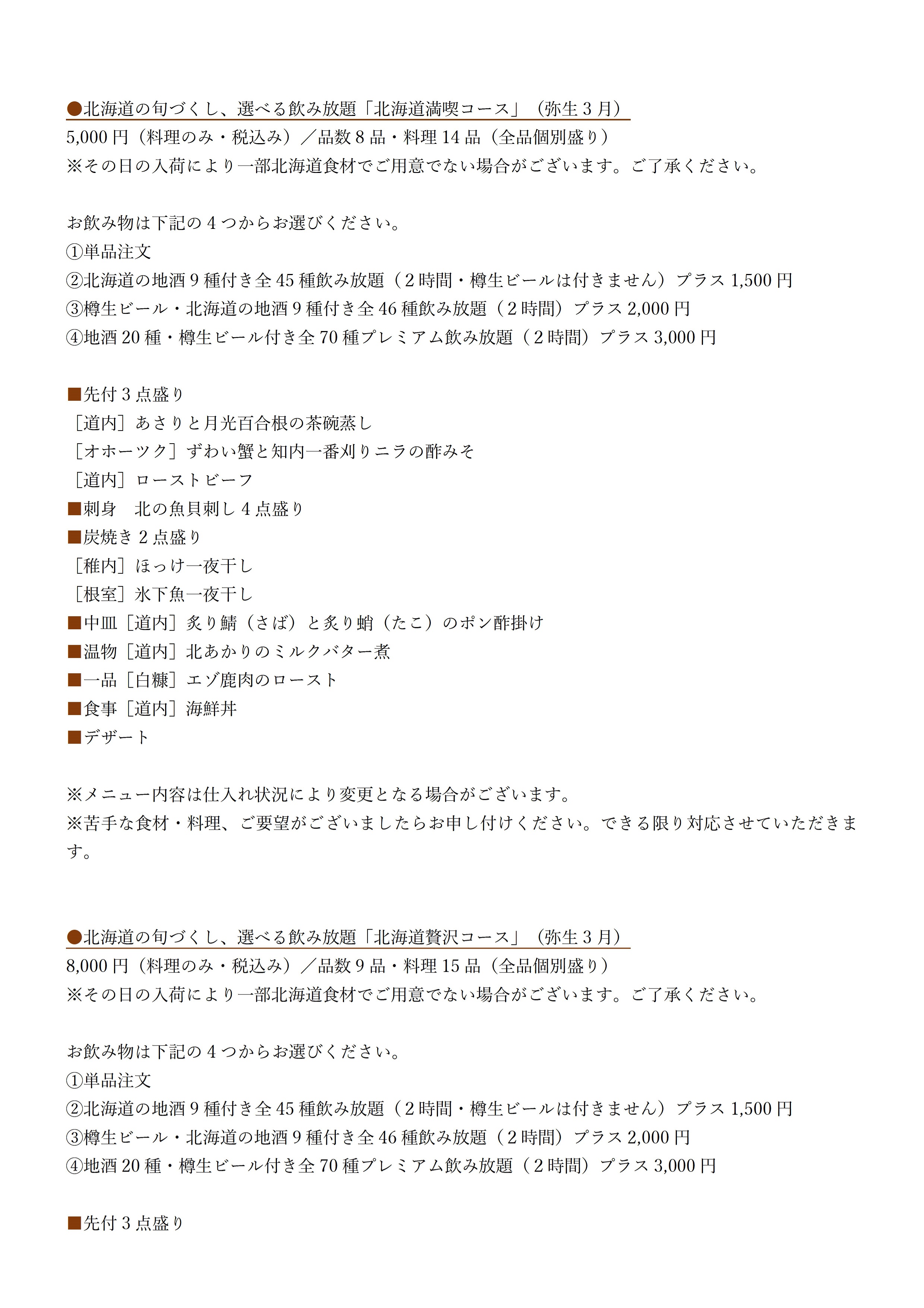 - 【北海道満喫コース】 5,000円(料理のみ・税込)